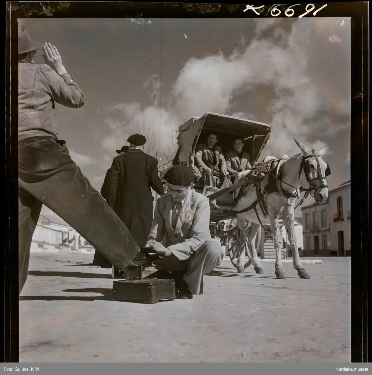568 F. Stieg Trenter, Torremolinos. Stieg Trenter får sina skor putsade på gatan. Han hälsar på ett par män som passerar i en kärra dragen av åsna/häst.