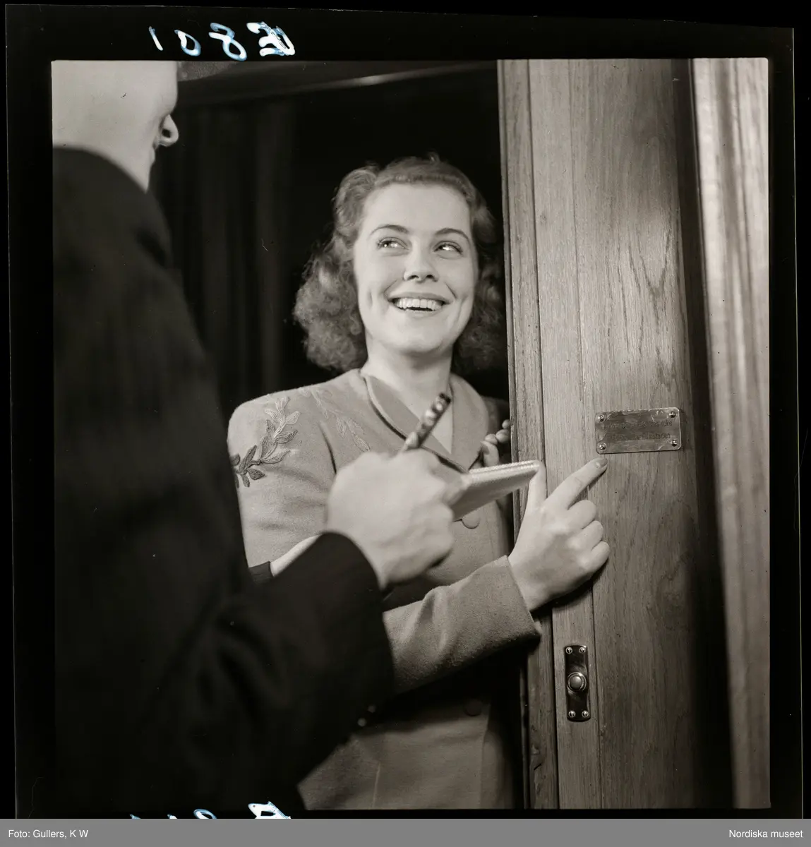 Titel: 583 Sickan Carlsson för 25an Allers. Sickan Carlsson i en dörröppning, pekar på en skylt "Autografer påskrivas icke. Hänviselse Filmstaden".