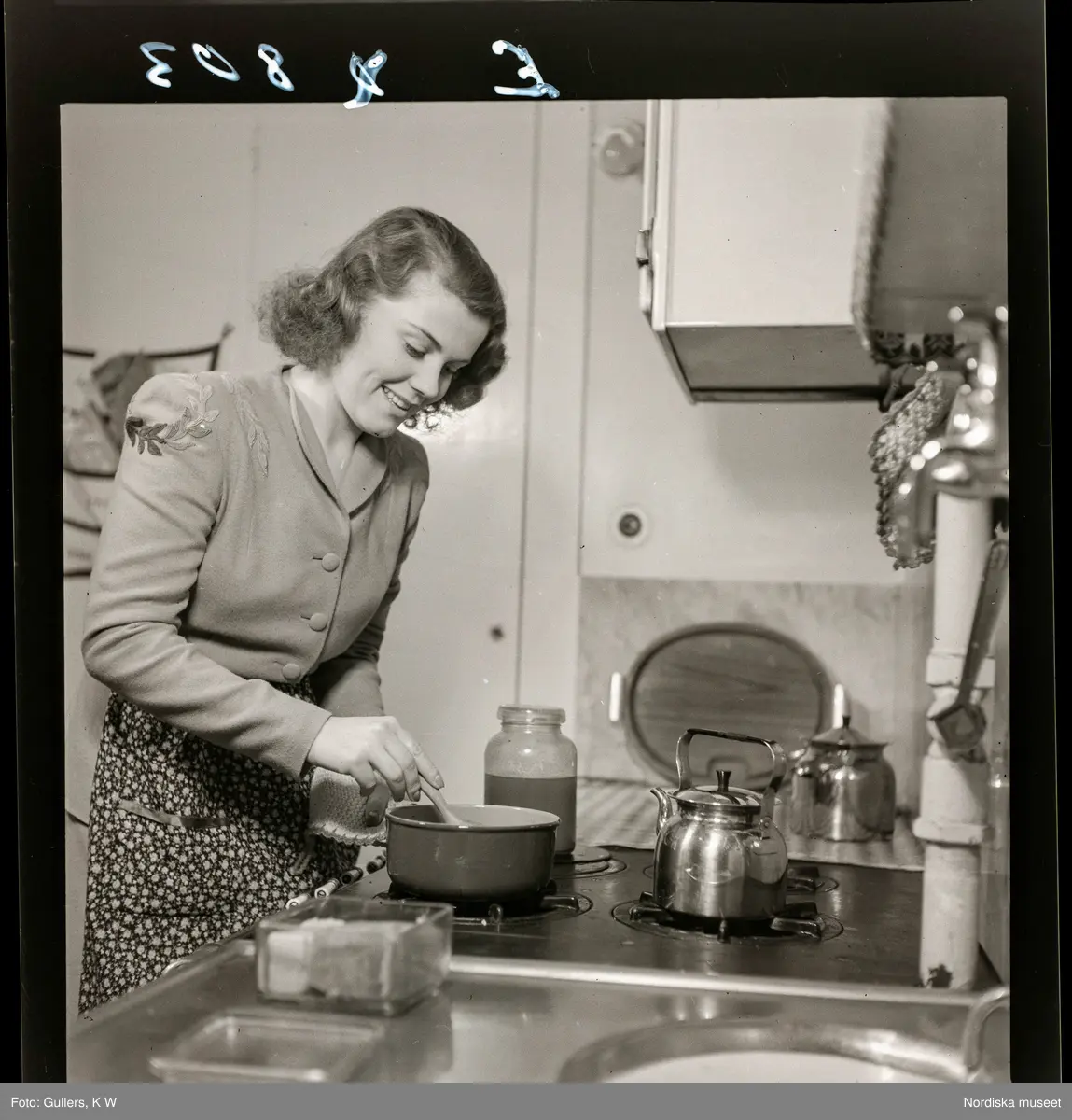 583 Sickan Carlsson för 25an Allers. Sickan Carlsson lagar mat på spisen i ett kök.