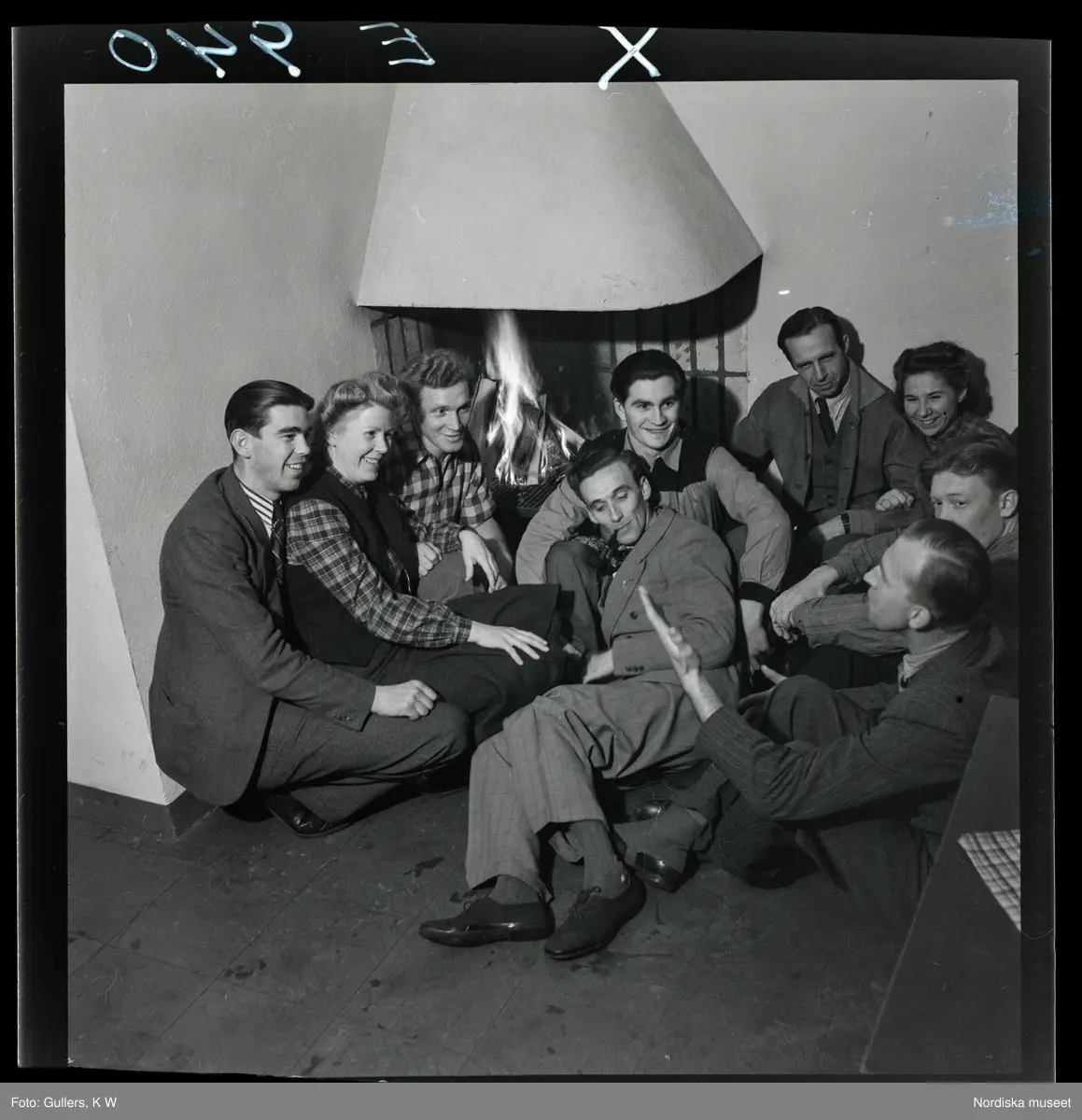 584 Brunsviks Folkhögskola. Samling kring elden. En grupp studenter umgås framför en öppen brasa.