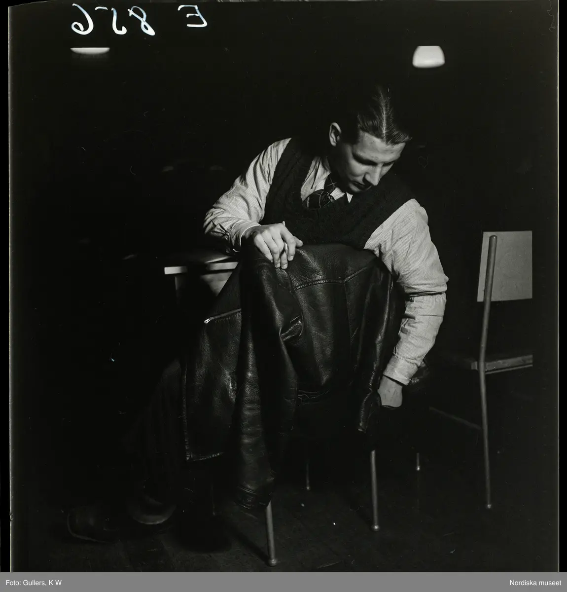 584 Brunsviks Folkhögskola. En student letar efter något i fickan på sin läderjacka han hängt över stolsryggen.