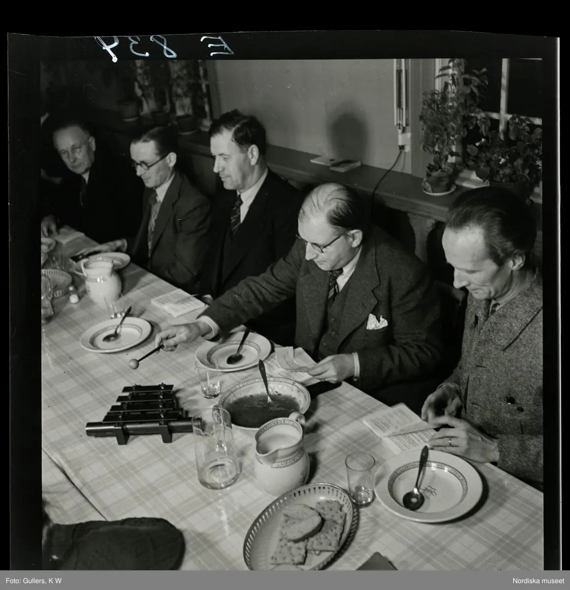 584 Brunsviks Folkhögskola. Män kring ett dukat middagsbord. En man slår på en liten xylofon.