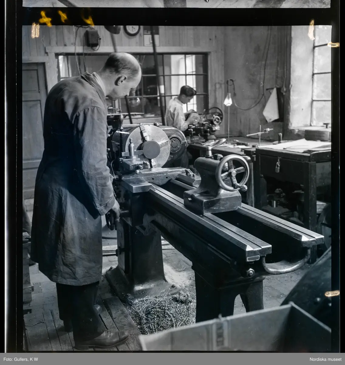 584 Brunsviks Folkhögskola. Ett par män arbetar vid maskiner i verkstad.