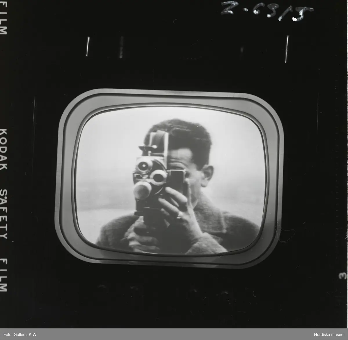2413 Television Tak för TV; Sändning; Från utsändn. T-V-Studion + KWG på TV . Fotograf K W Gullers i TV-studio vid inspelning av fotografi-kurs. "Gullers fotokurs"