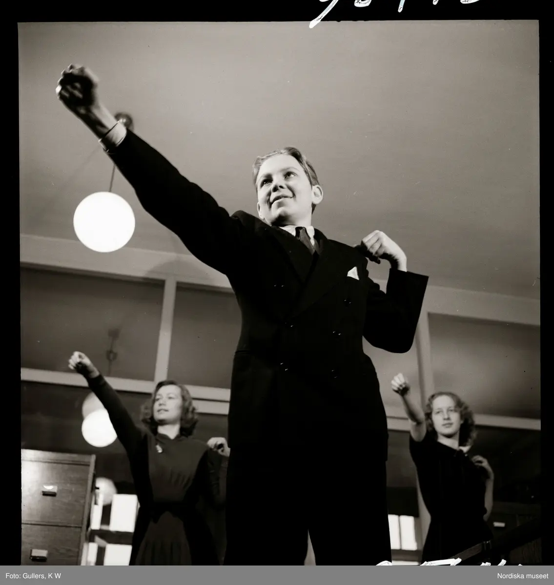 589 G, Åtvidabergs Industrier kontorsgymnastik. En grupp anställda gymnastiserar på ett kontor.
