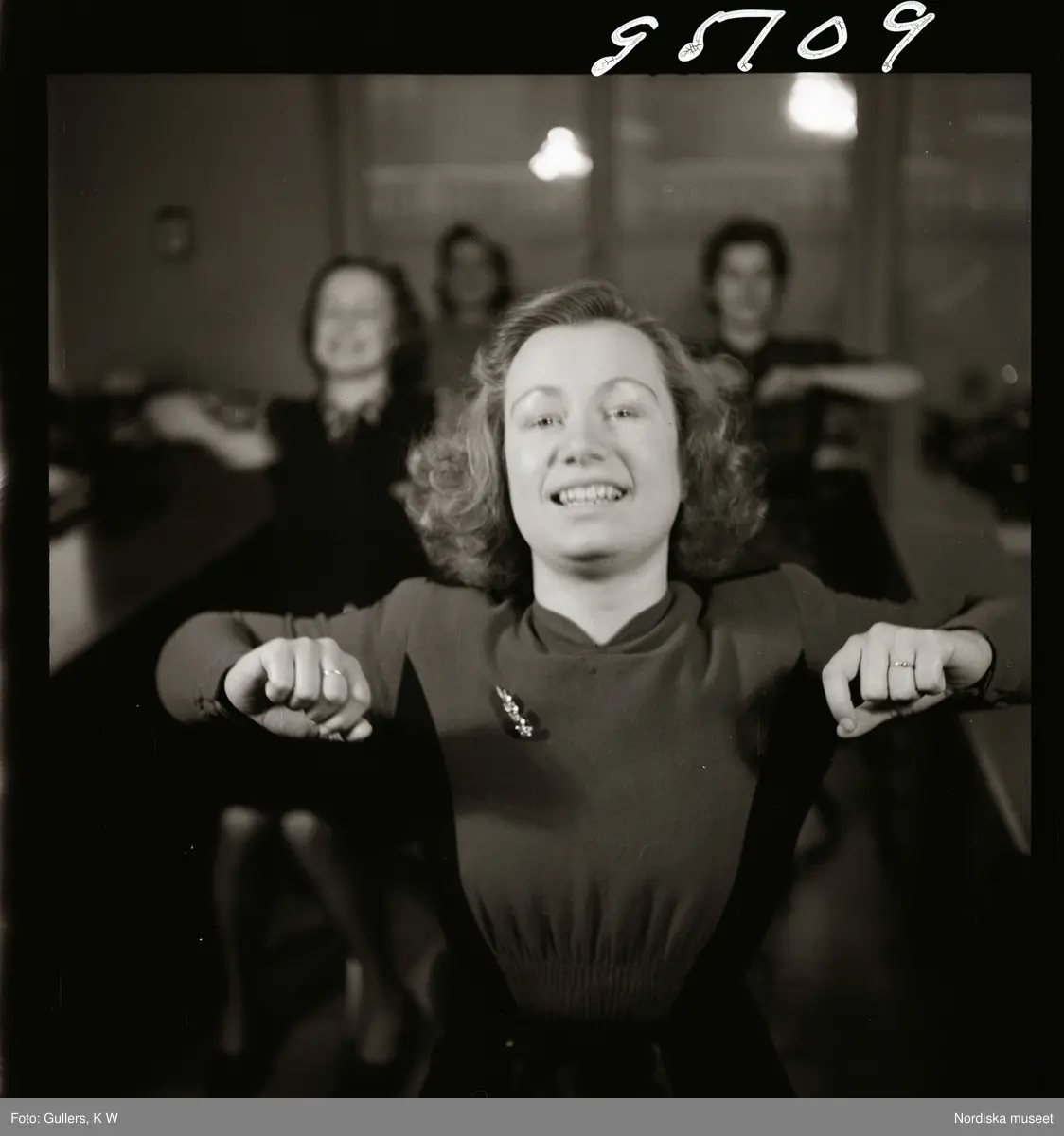 598 G, Åtvidabergs Industrier kontorsgymnastik. En grupp anställda gymnastiserar på ett kontor.