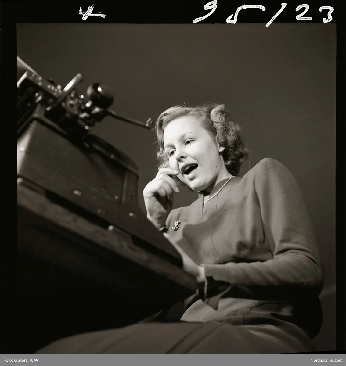 603 G, Åtvidabergs Industrier kontorsgymnastik. Kvinna arbetar vid skrivmaskin.
