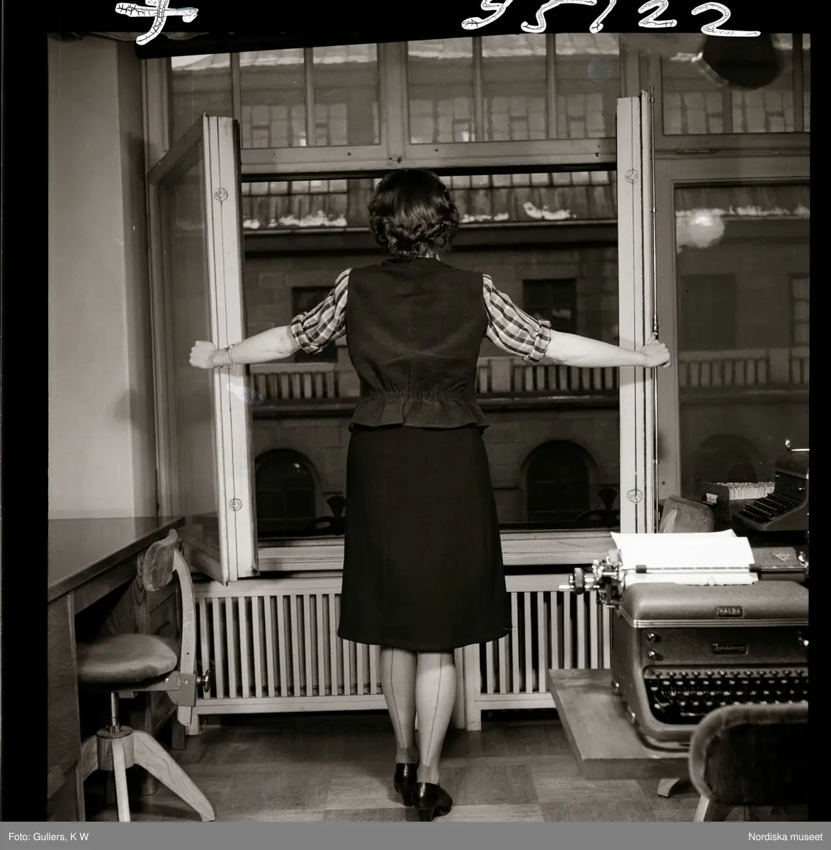 610 G, Åtvidabergs Industrier kontorsgymnastik. Kvinna står i öppet fönster på ett kontor.