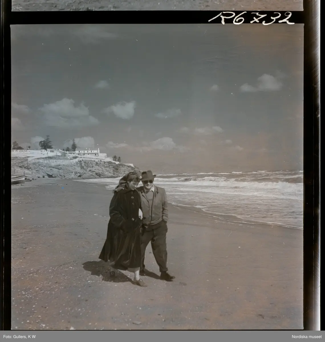 568 F. Stieg Trenter, Torremolinos. Stieg Trenter på promenad på stranden med en kvinna.