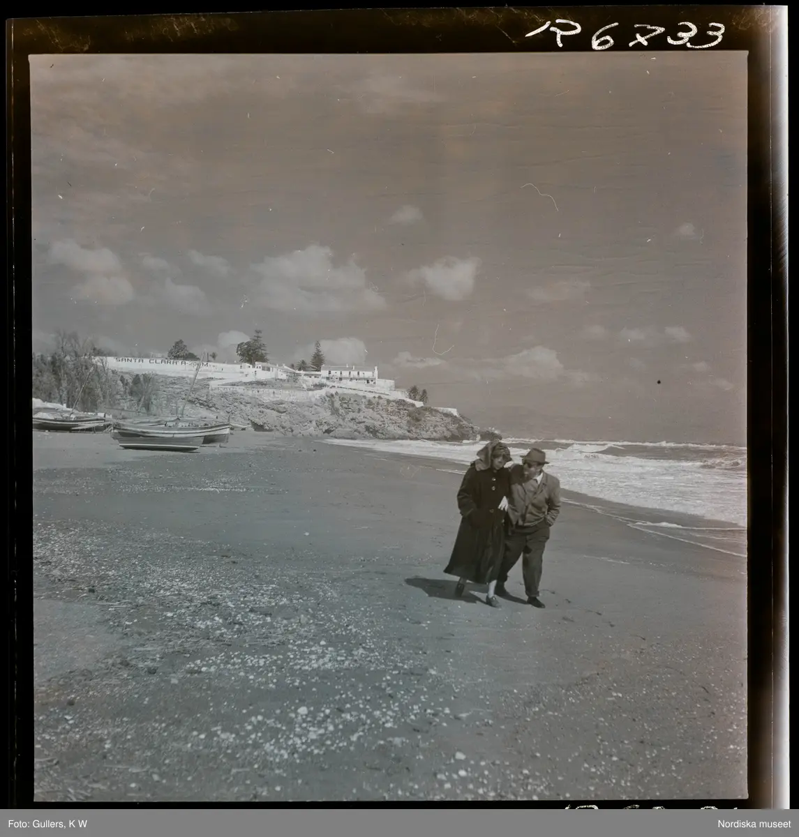 568 F. Stieg Trenter, Torremolinos. Stieg Trenter på promenad på stranden med en kvinna.