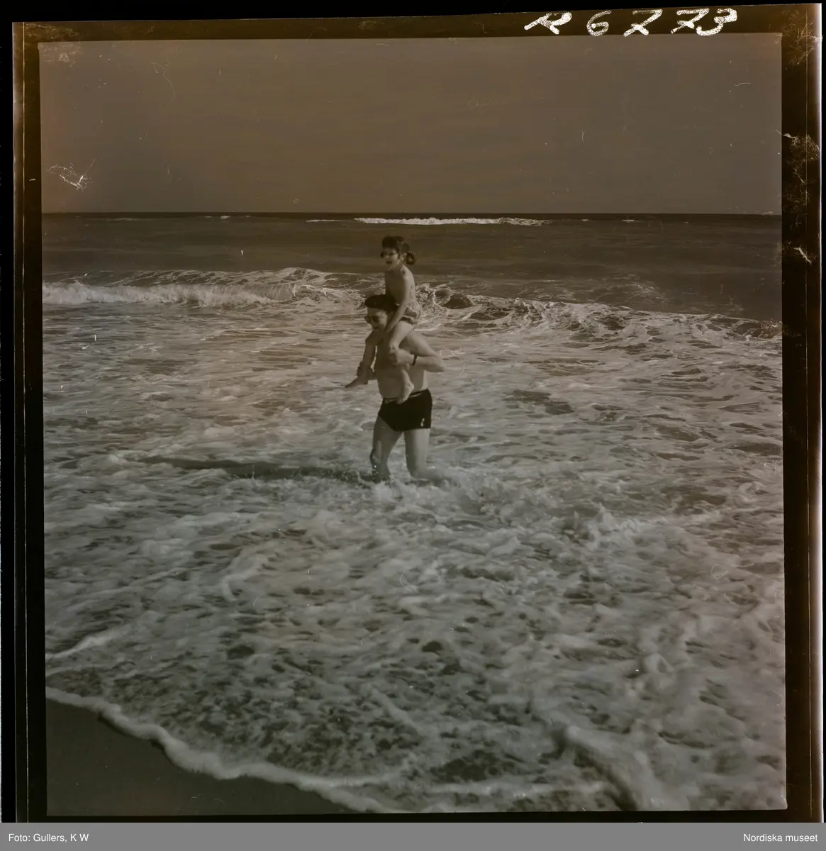 568 F. Stieg Trenter, Torremolinos. Stieg Trenter bär sin dotter på sina axlar i vattenbrynet.