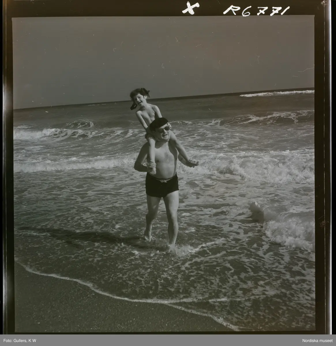 568 F. Stieg Trenter, Torremolinos. Stieg Trenter bär sin dotter på sina axlar i vattenbrynet.