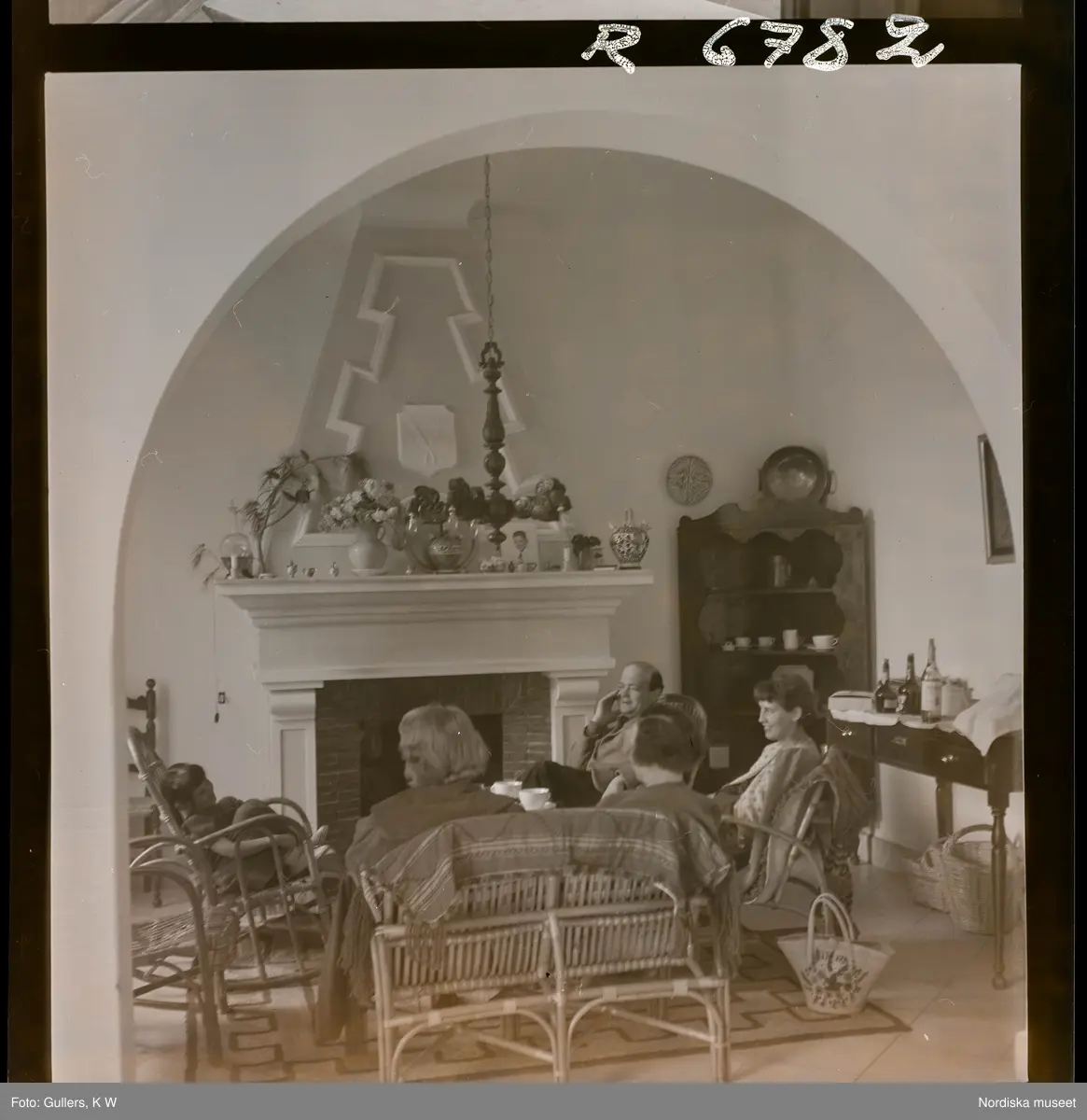 568 F. Stieg Trenter, Torremolinos. Ett sällskap umgås i en soffgruppav rotting, framför en öppen spis.