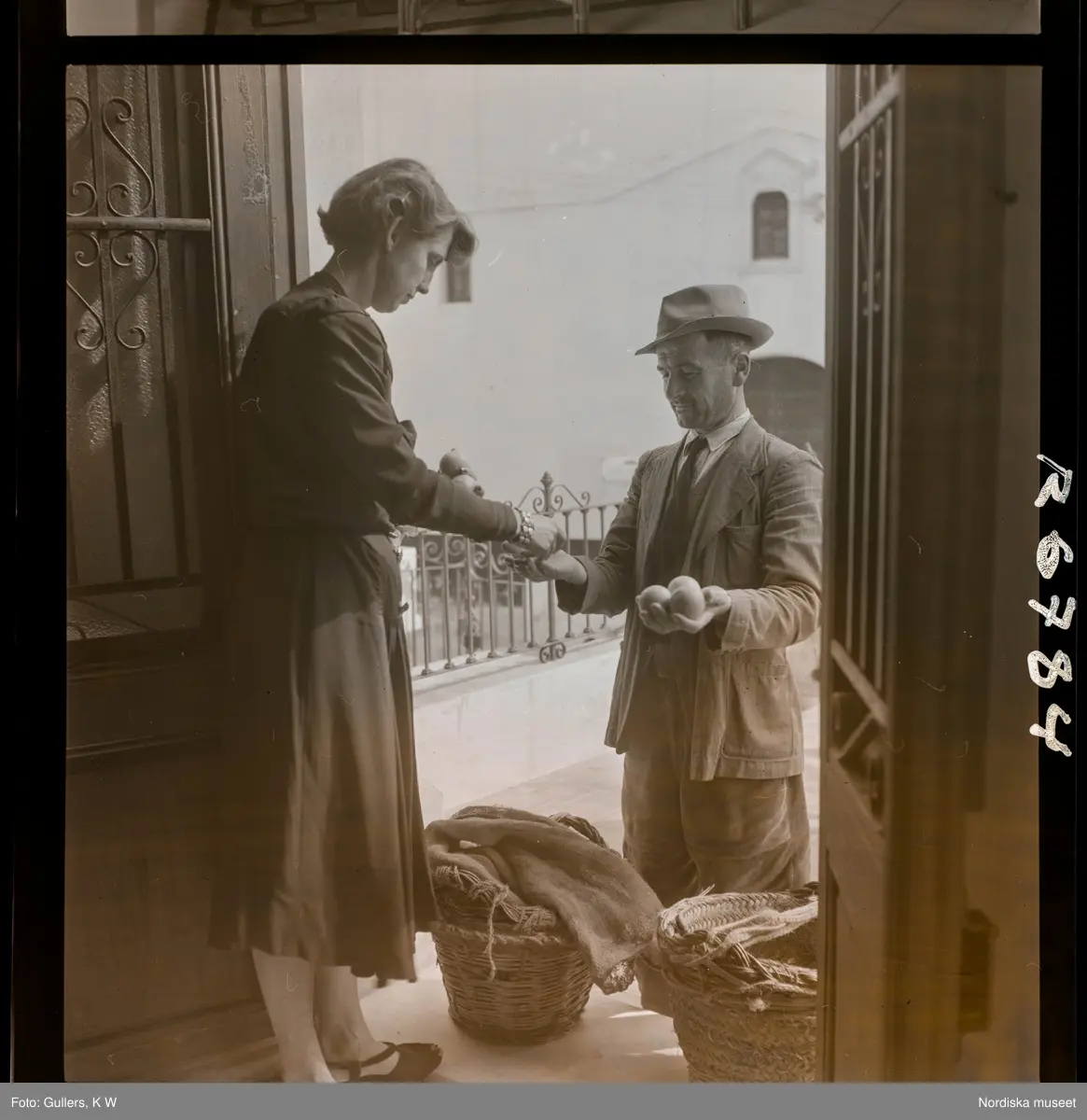 568 F. Stieg Trenter, Torremolinos. Försäljning vid dörren. En kvinna köper frukter av en man.