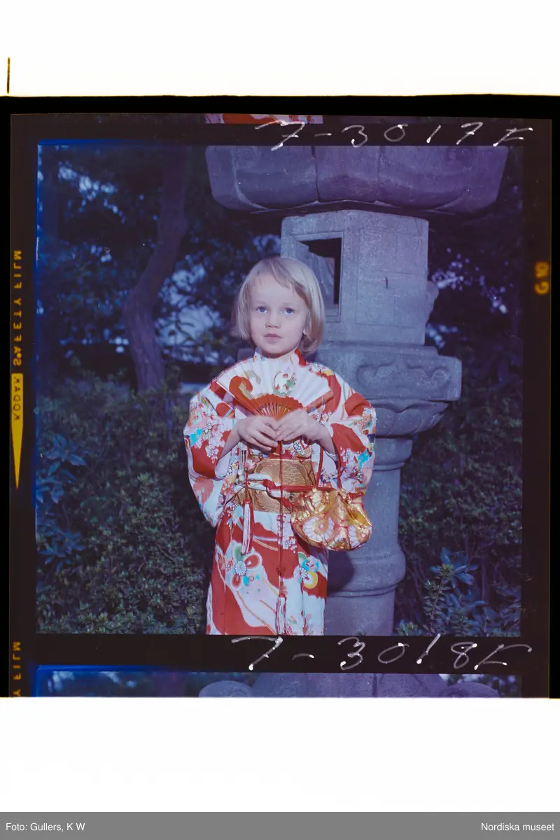 585/8 Facit Tokyo Daberg. Porträtt av ett barn i kimono som står i en trädgård.