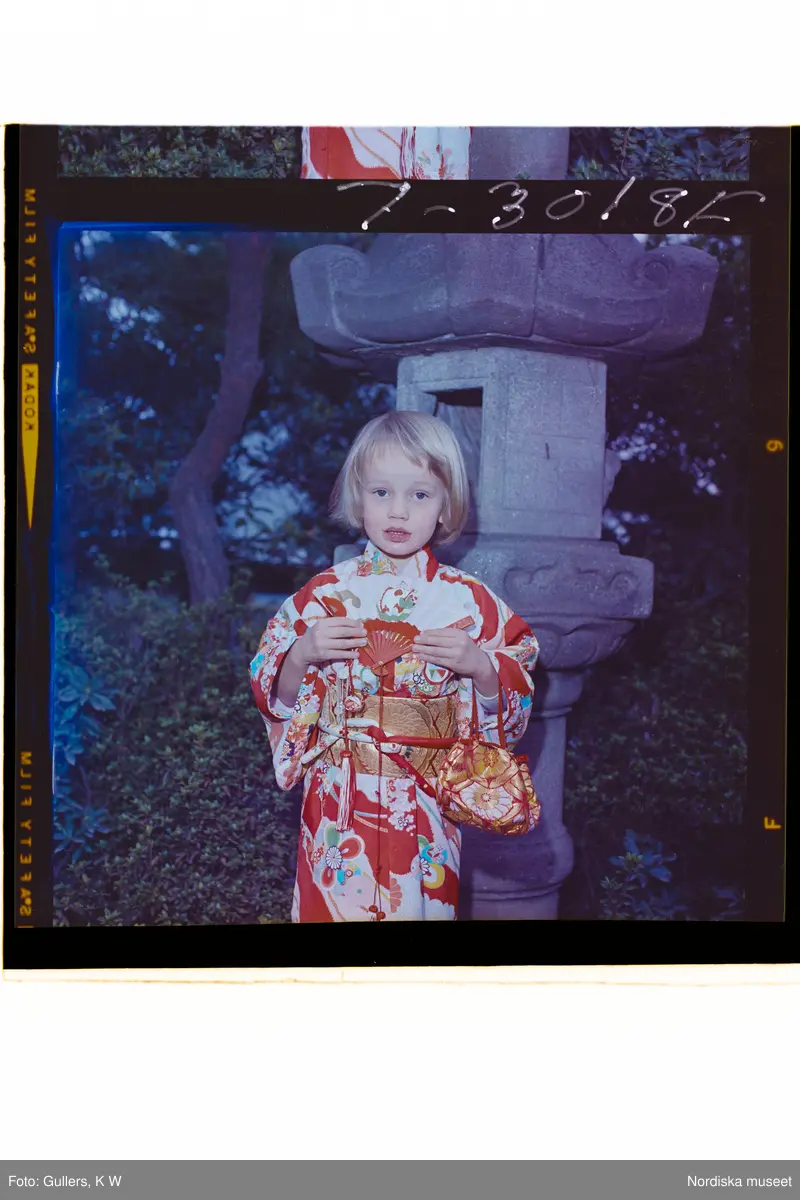 585/8 Facit Tokyo Daberg. Porträtt av ett barn i kimono som står i en trädgård.