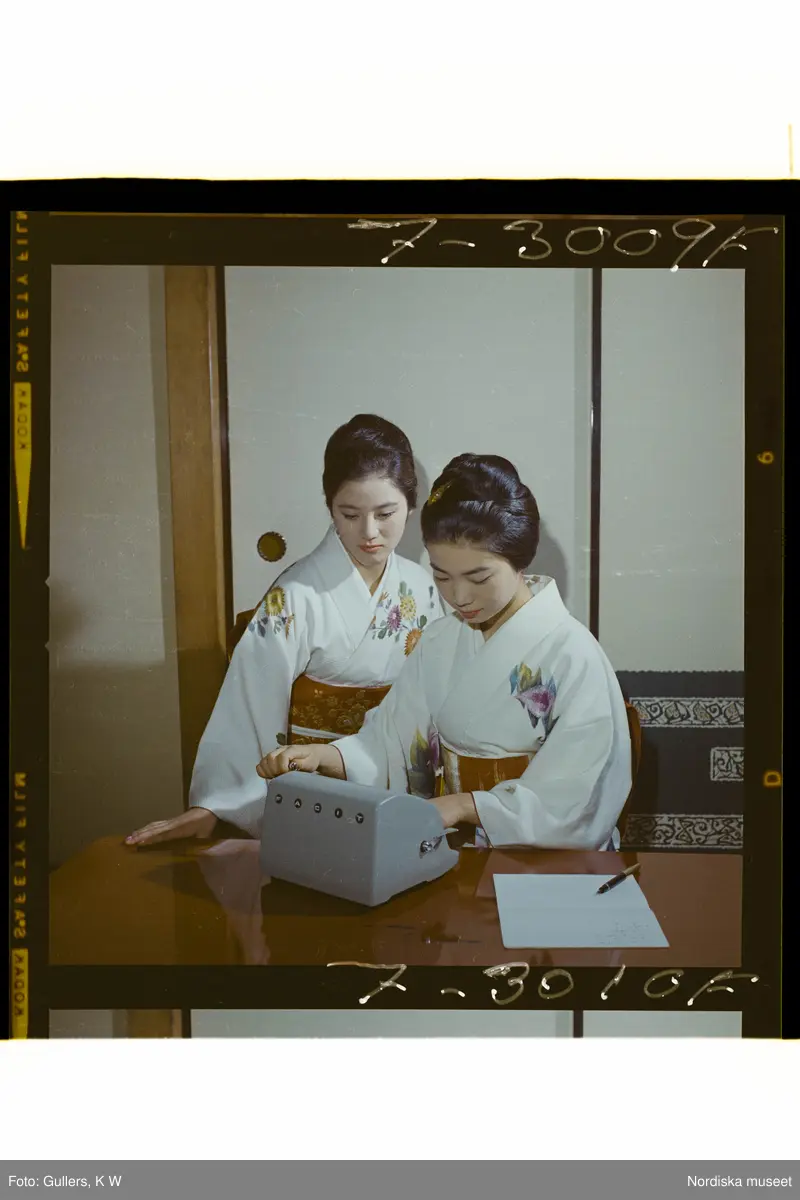 585/8 Facit Tokyo Daberg. Två kvinnor i kimonos vid en Facit maskin.