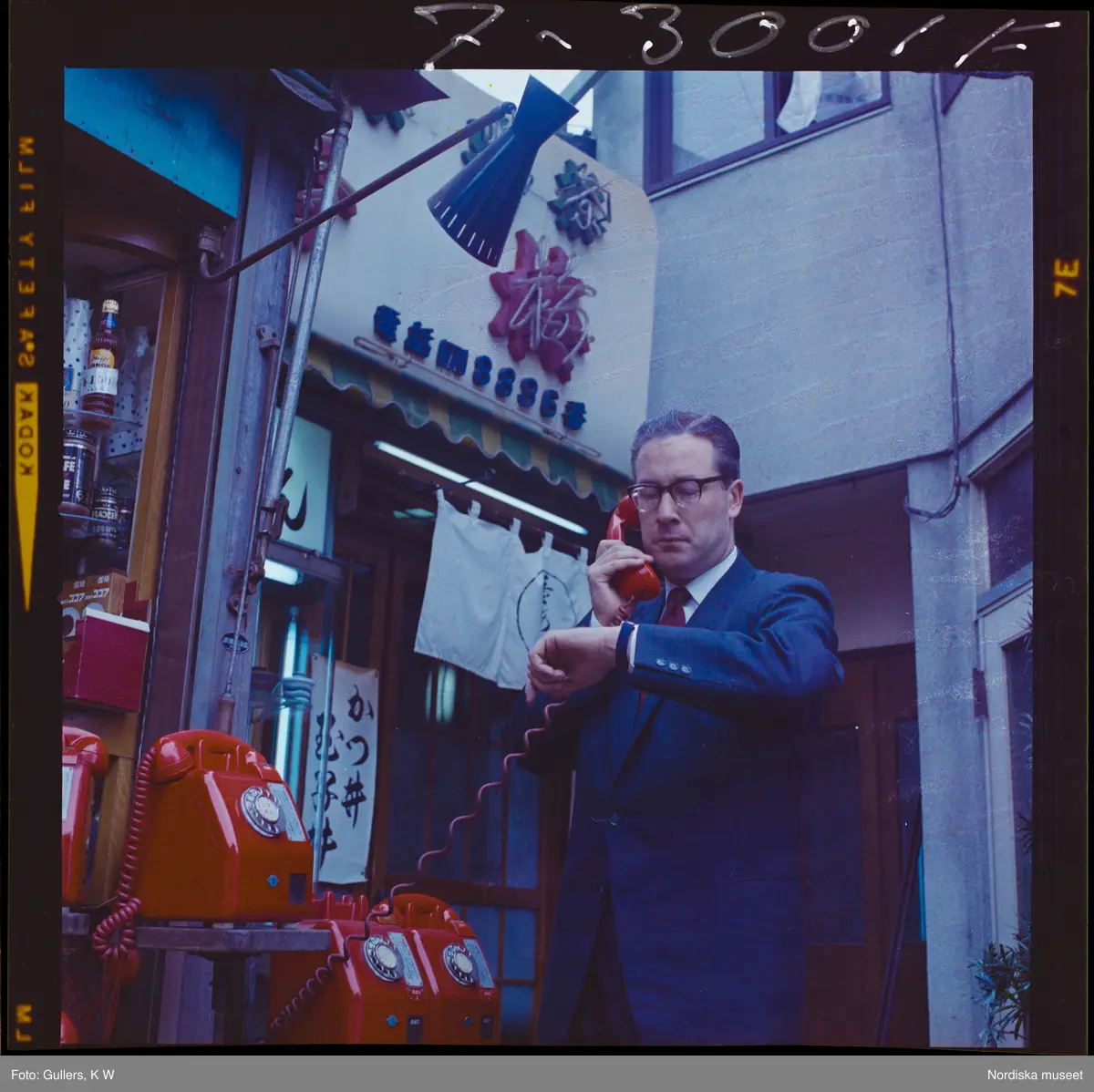 585/8 Facit Tokyo Daberg. En man telefonerar och tittar på sitt armbandsur, vid en station med flera röda telefonapparater.
