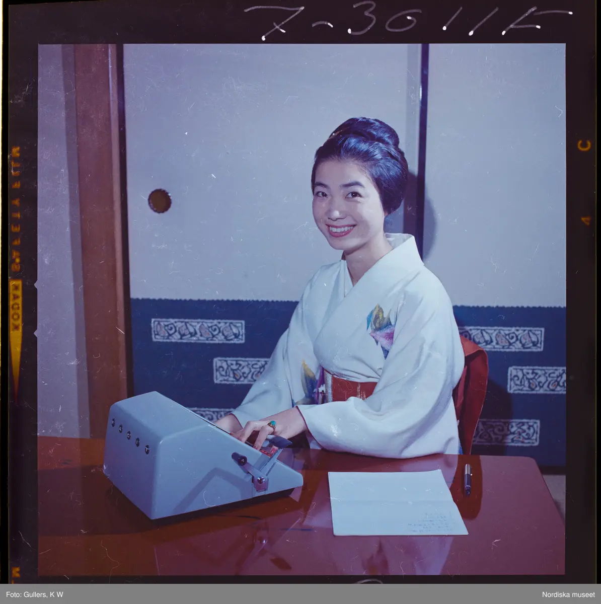 585/8 Facit Tokyo Daberg. Porträtt av en kvinna i kimono som arbetar vid en Facit maskin.