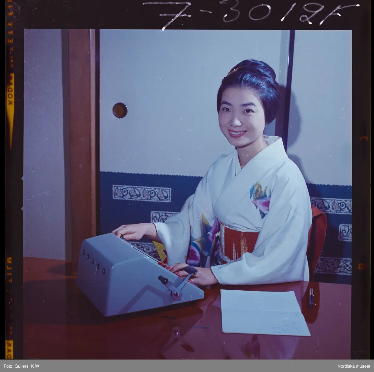585/8 Facit Tokyo Daberg. Porträtt av en kvinna i kimono som arbetar vid en Facit maskin.