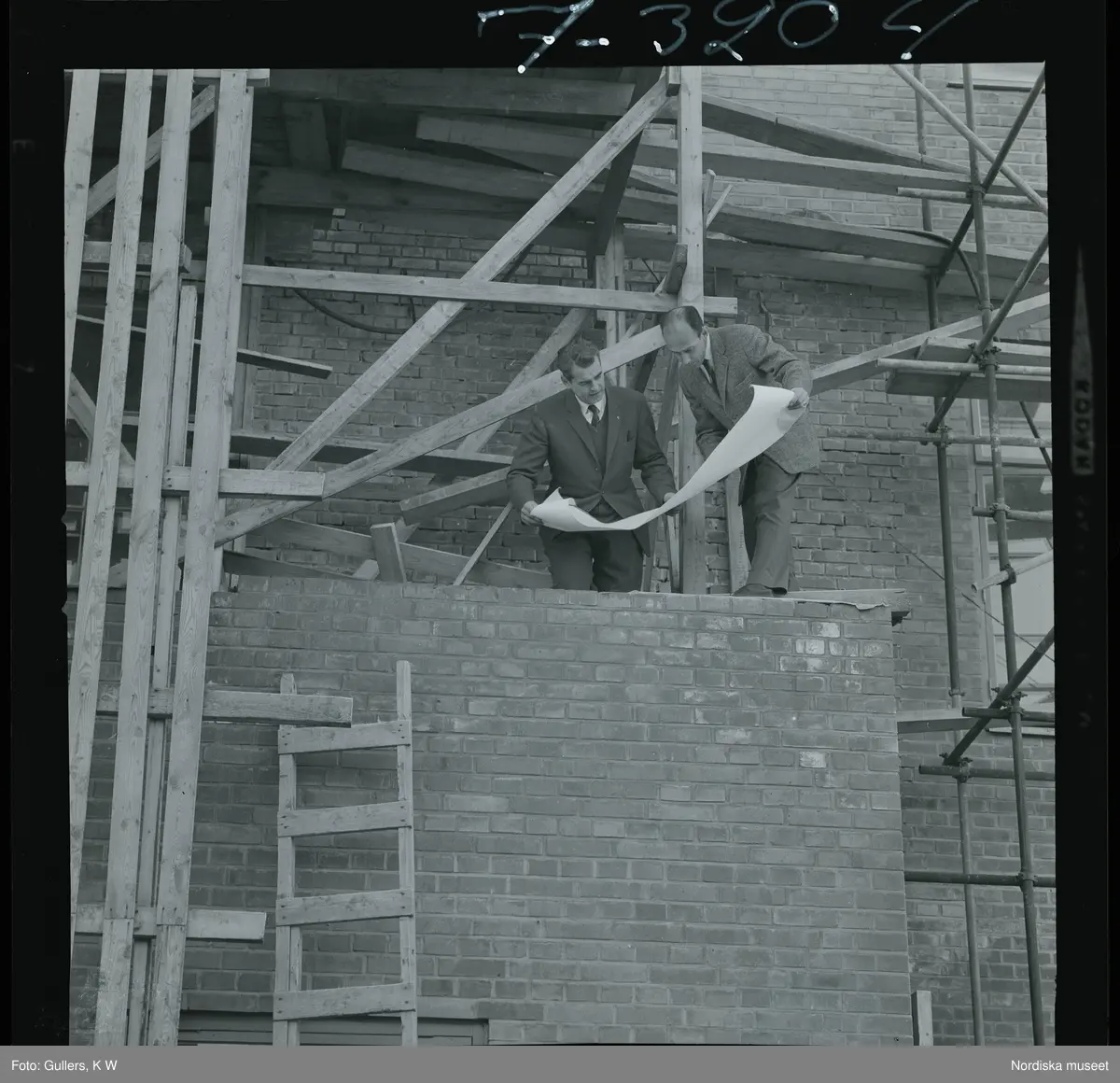 585/8 Facit Tokyo Daberg. Två män i kostym står på ett bygge och studerar en ritning.