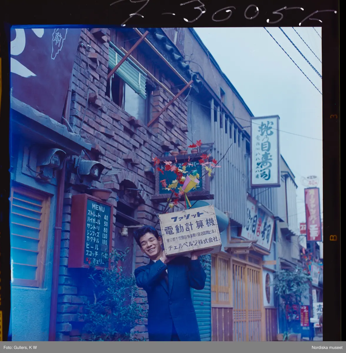 585/8 Facit Tokyo Daberg. En man ute på gatan bär en låda av trä på axeln.