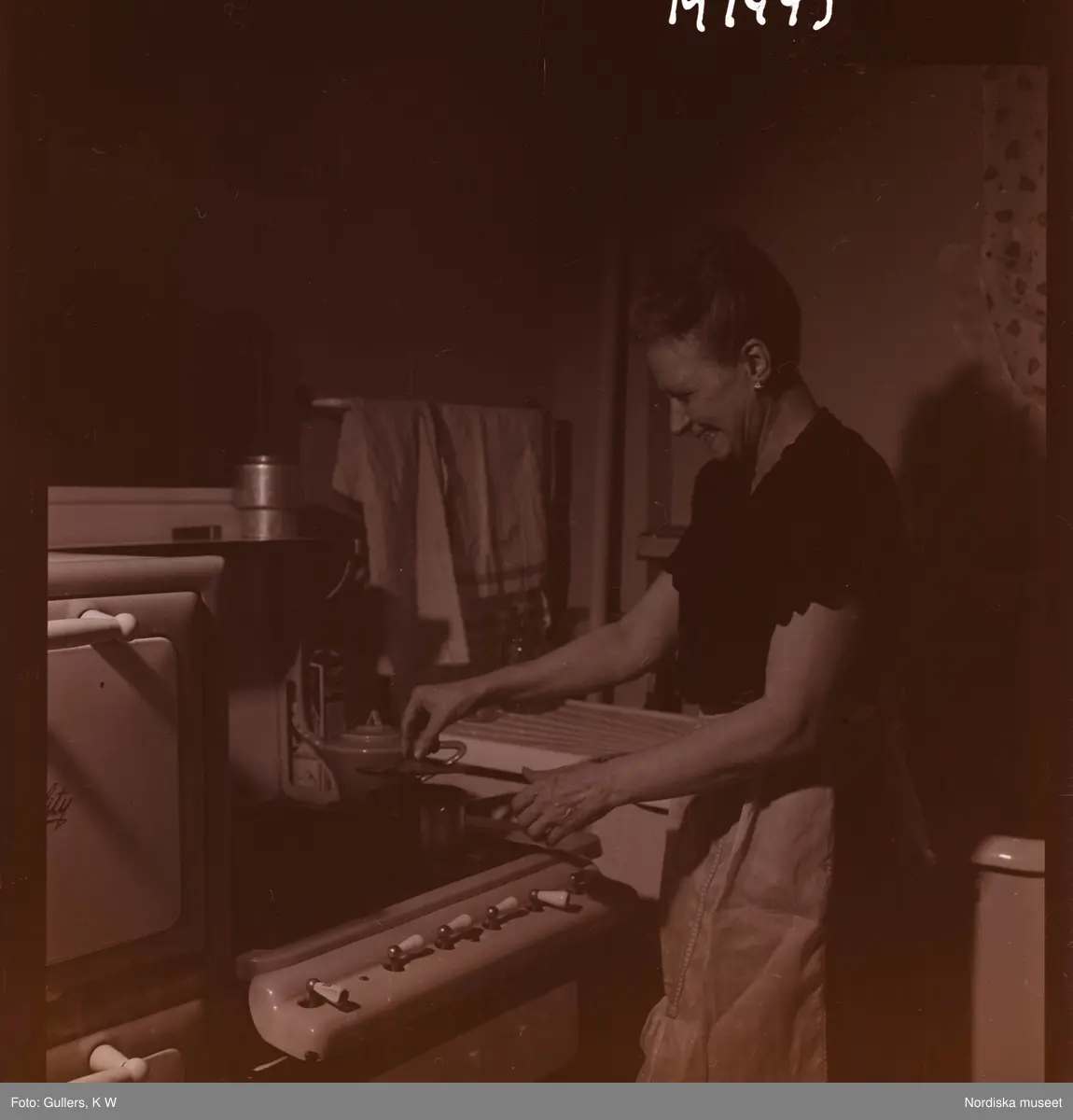 1690 New York, allmänt. En kvinna lagar något i en kastrull på spisen.