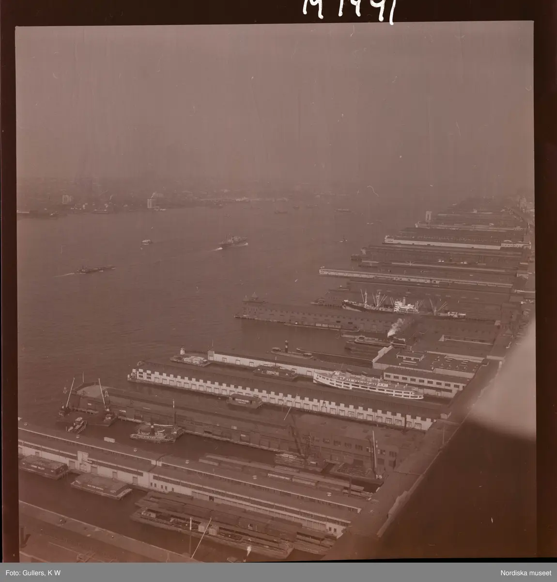 1690 New York, allmänt. Vy över magasin på pirer längs Hudson-floden.