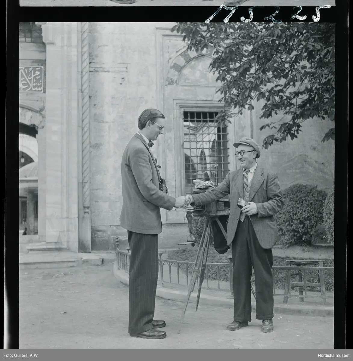 1717/K Istanbul allmänt. Fotograf K W Gullers skakar hand med en kollega, en gatufotograf som står vid sin kamera på lådkamera på stativ.