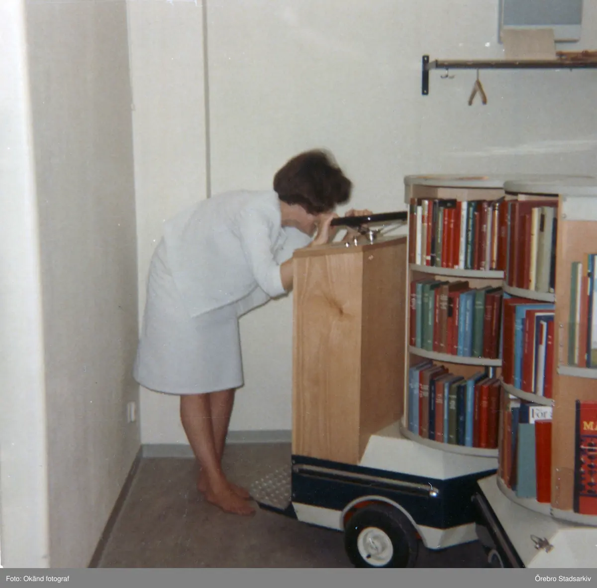 Barbro tittar på nya el-boktrucken, 1968-07-23
