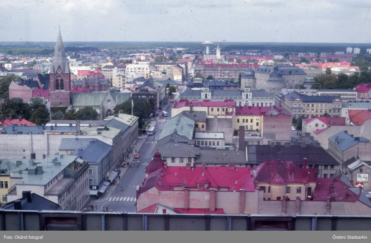Foto över centrala Örebro med bland annat Nikolaikyrkan, 1980-tal
