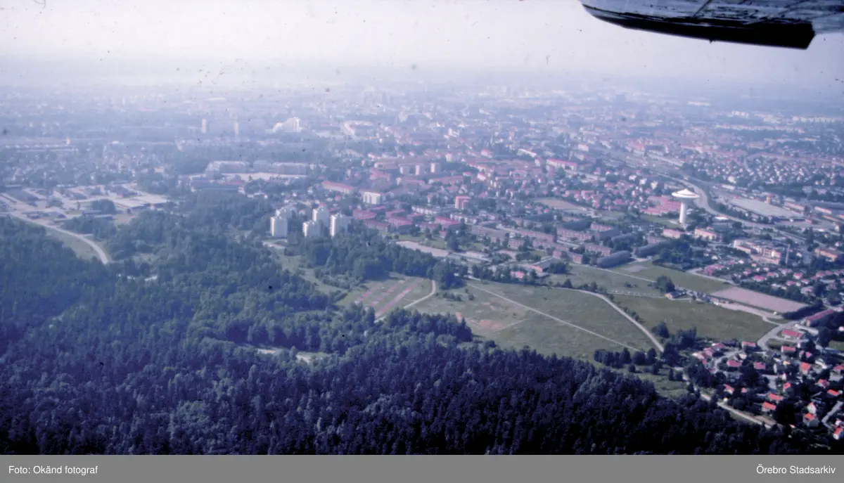 Flygfoto över norra Örebro med bland annat Svampen, 1980-tal