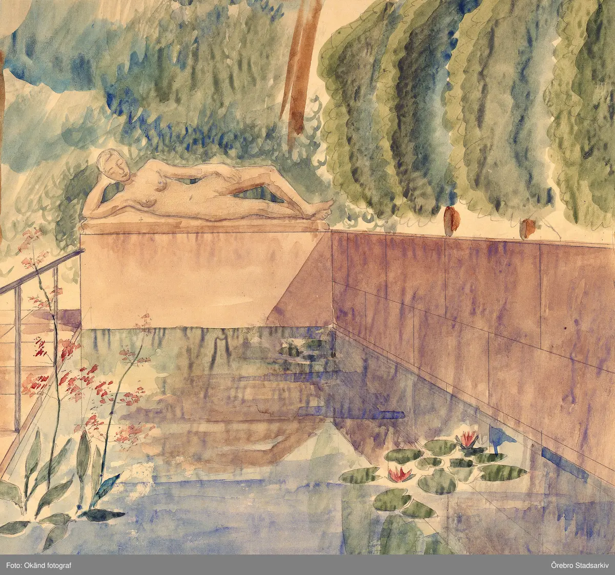 Ritningsförslag för en damm med liggande staty på Stortorget, 1930-tal