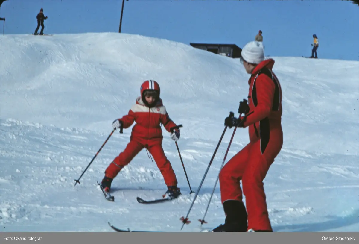 Två slalomåkare i lungt tempo nedför Storstenshöjden, 1970-tal