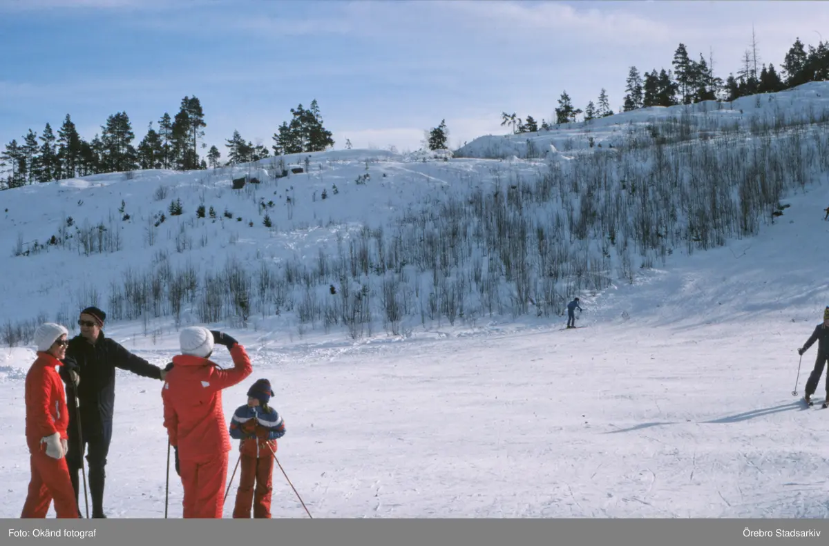 Barn och vuxna i samspråk nedanför barnbacken i Storstenshöjden, 1970-tal