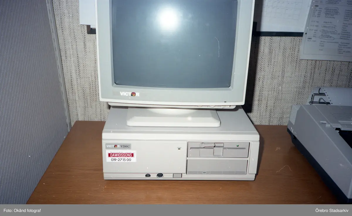 Dator med monitor på skrivbord i Tysslinge, 1990