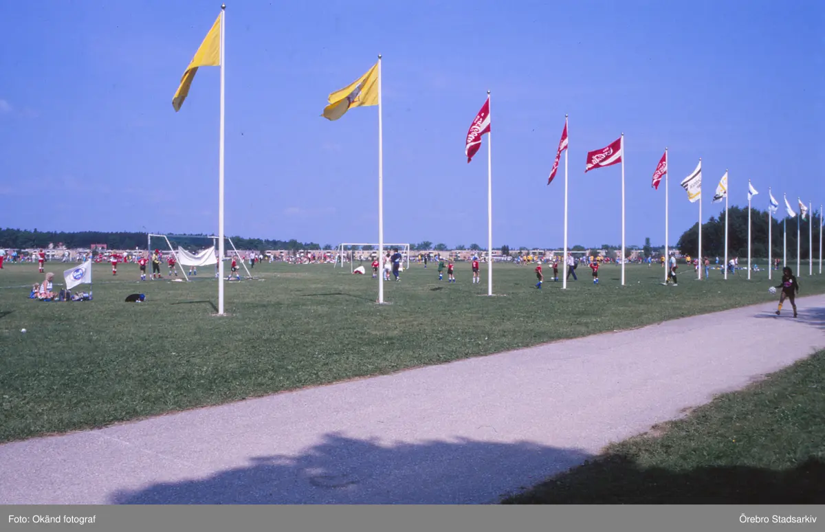 Många fotbollsspelande ungdomar på Rosta Gärde, 1988