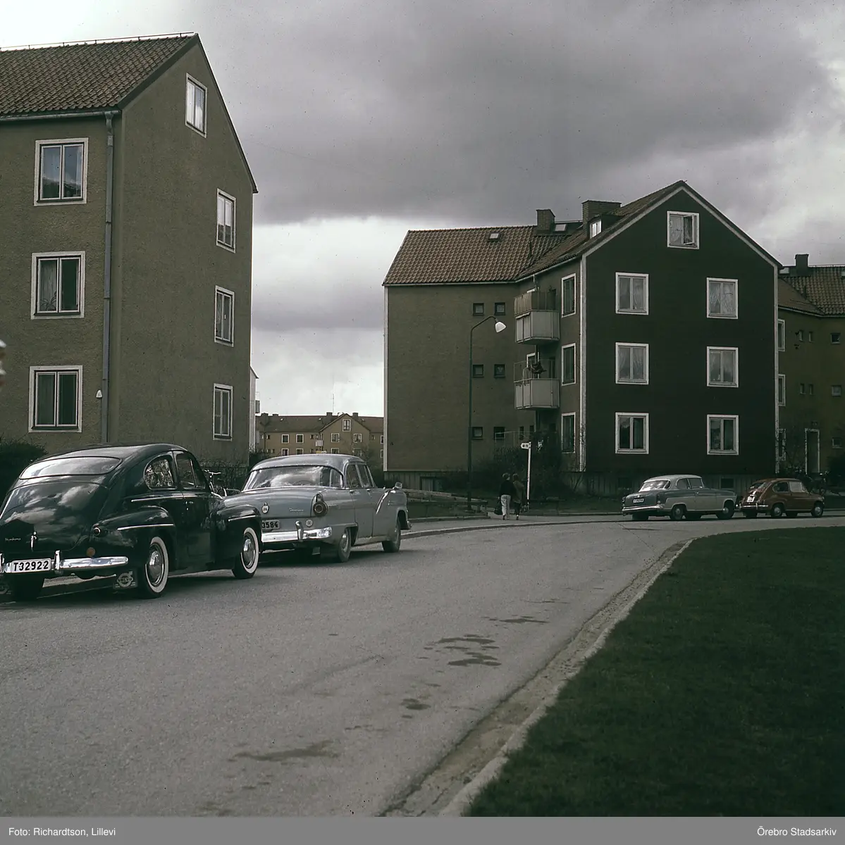 Bilar parkerade längst gatan i Rosta, 1960-tal