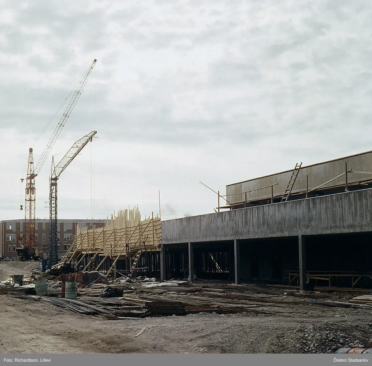 Lyftkranar svävar över bygget av Varberga, 1960-tal