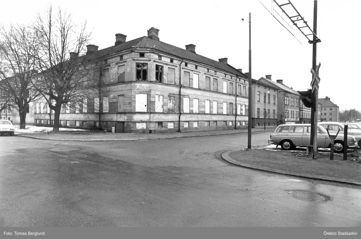 Rivningshus i hörnet Slottsgatan - Norra grev rosengatan, 1976