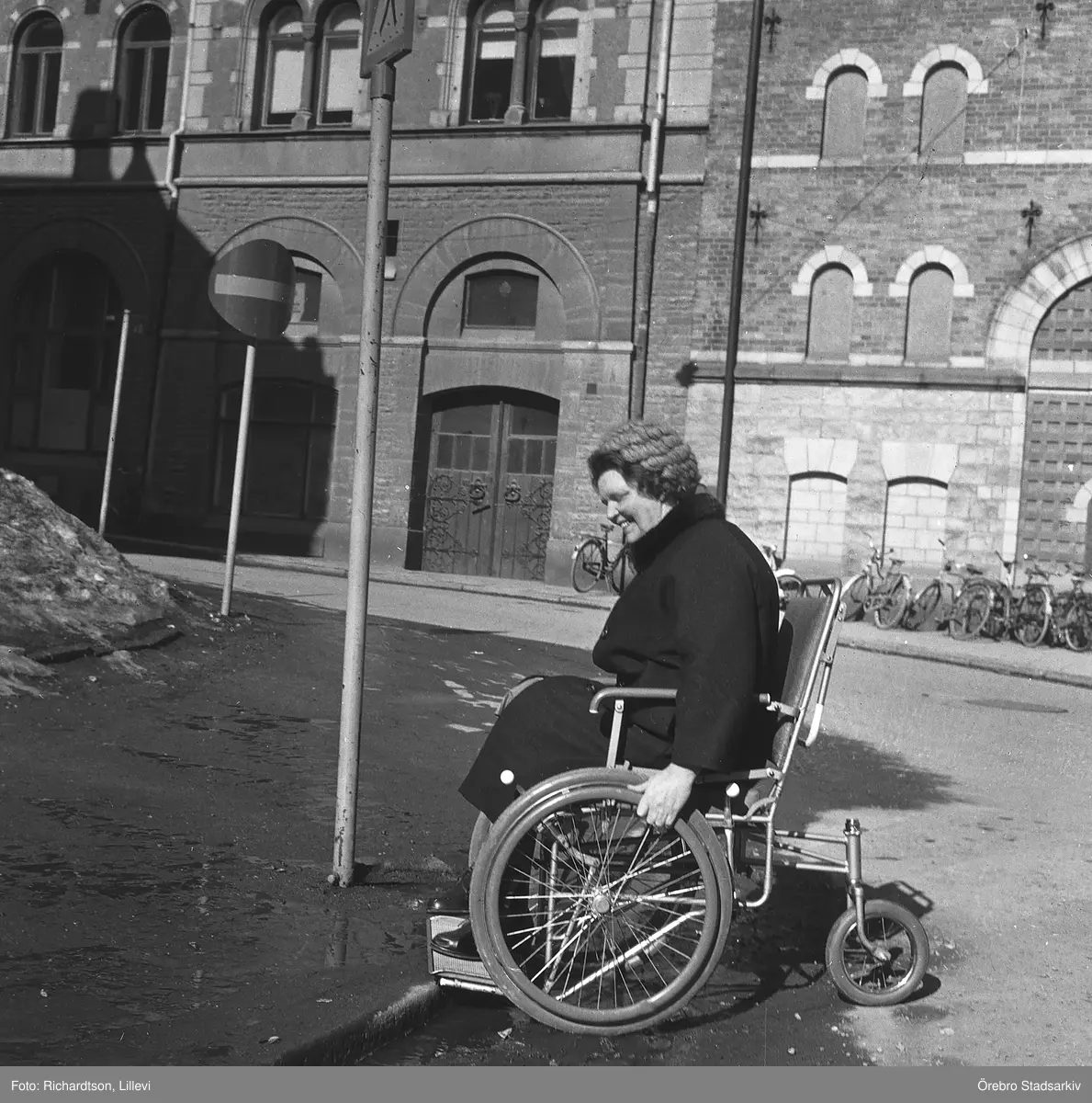 Svårighet att ta sig upp på trottoaren med rullstol i Centrum, 1970-tal