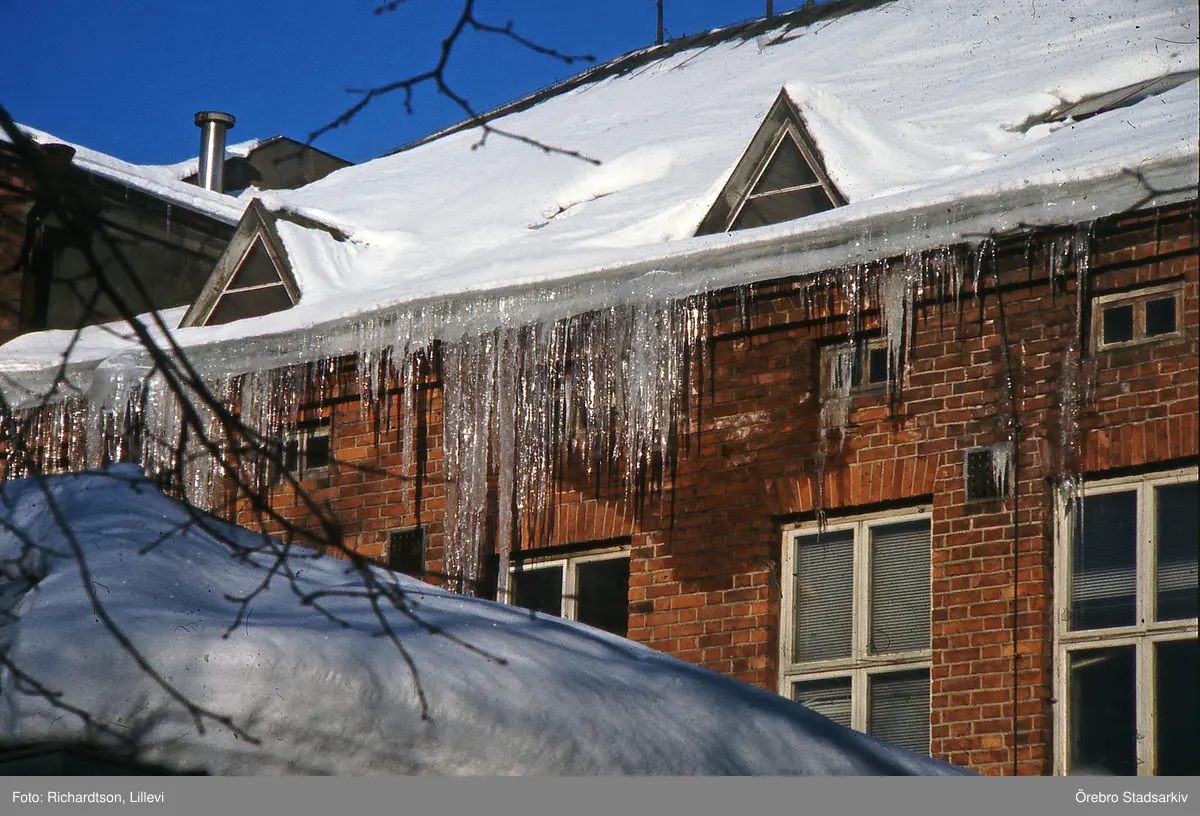 Snö och istappar från taken på Kexfabriken, 1970-tal