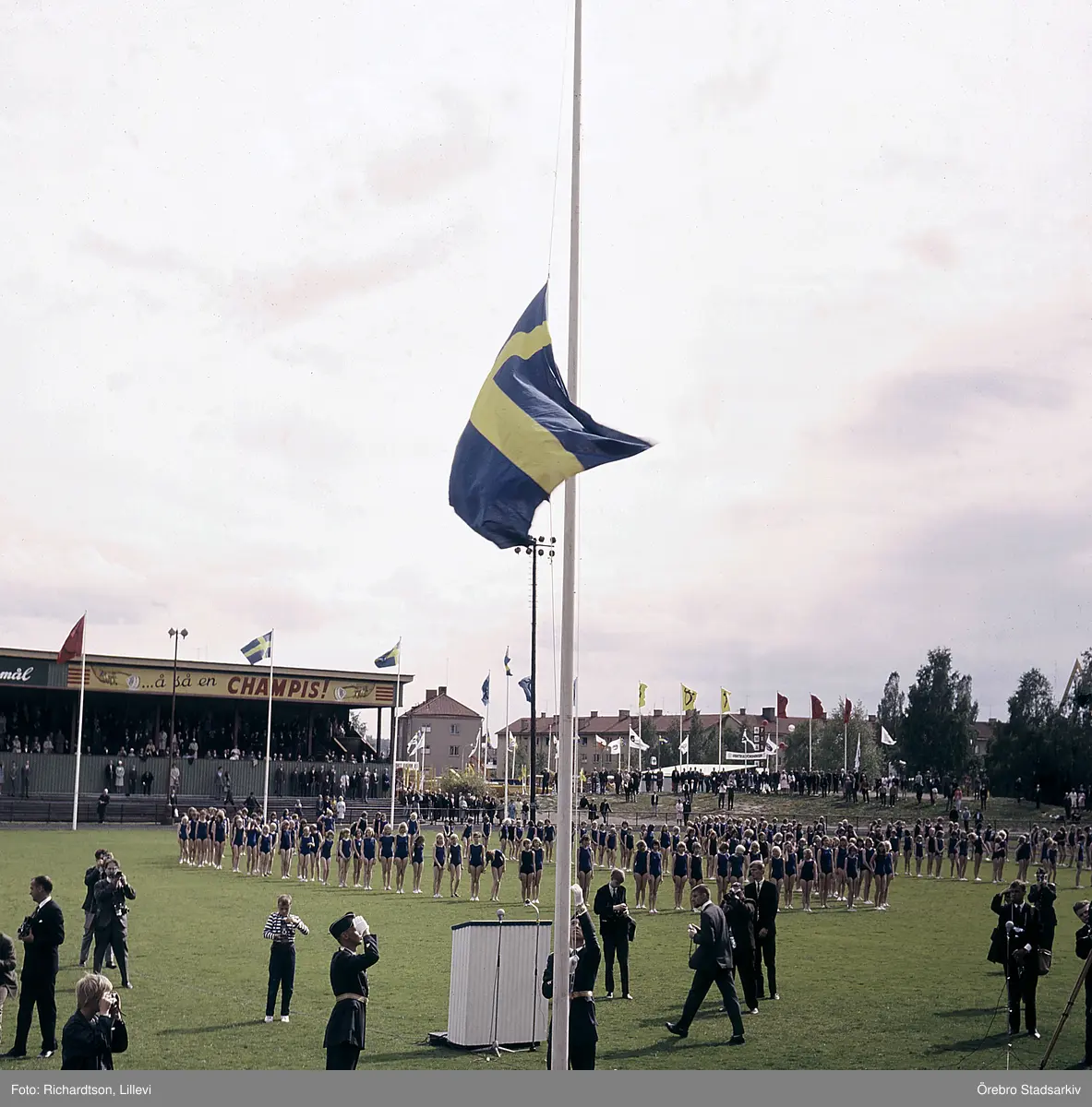 Flaggan hissas under gymnastikuppvisningen vid invigningen Örebro 700 år, 1965
