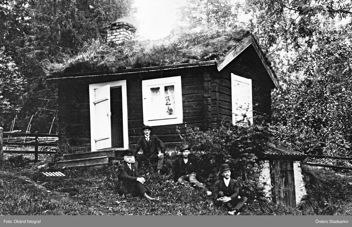 Män framför stuga, ca 1900