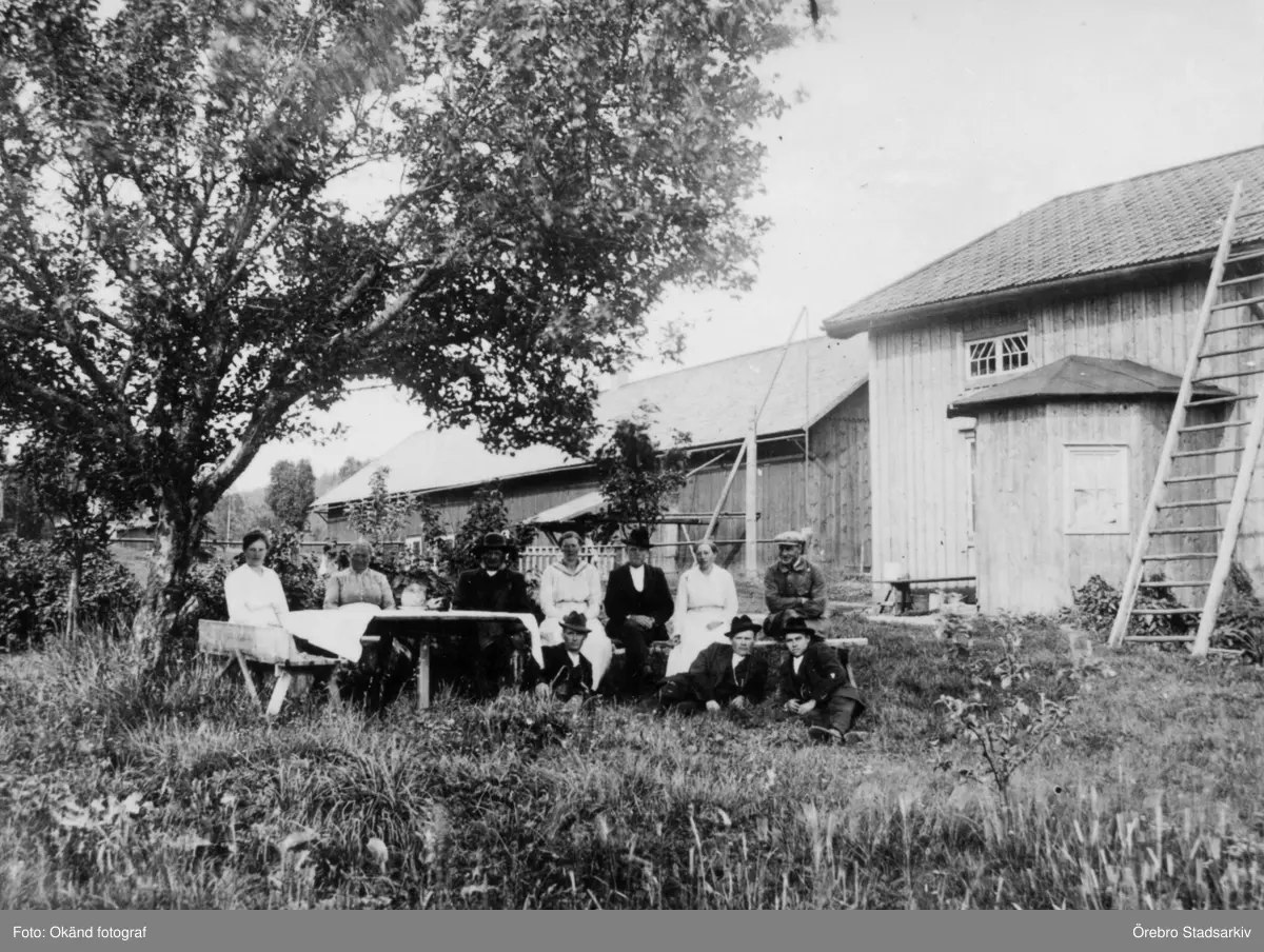 Kvinnor och män runt trädgårdsbord, 1910-tal