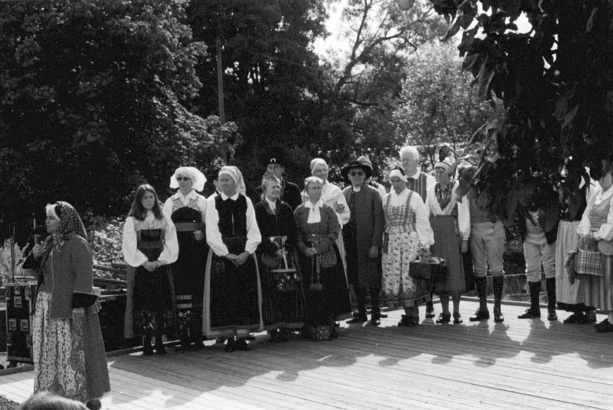 Utflykt under Kulturhuvudstadsåret 1998. Hembygdsfest i Rönninge by. Dräktvisning leds av Kerstin Stenholsz.