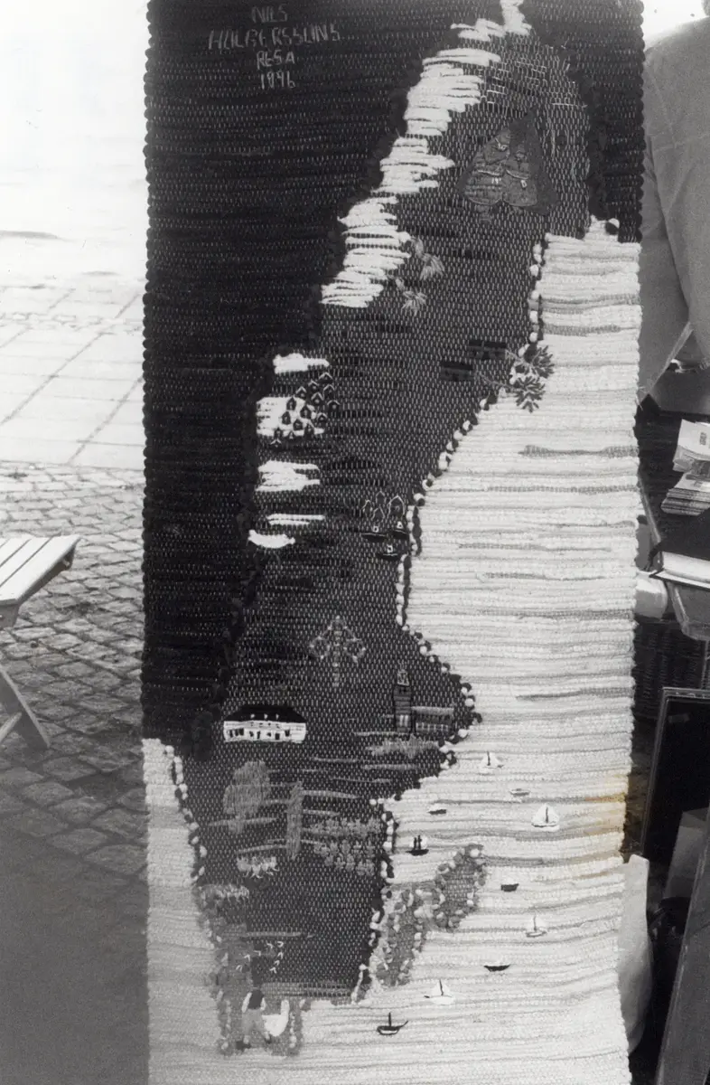 Hembygdens år. Trasbonad vävd och skänkt av Gudrun Sandén.