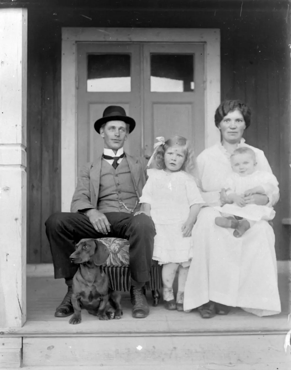 Familj på trappa till villa