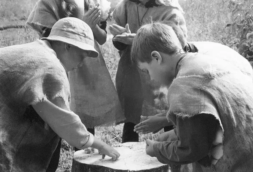 Ungdomsverksamhet. Klass 5 lever stenåldersliv i Forn-Åker i Åkers-Runö.