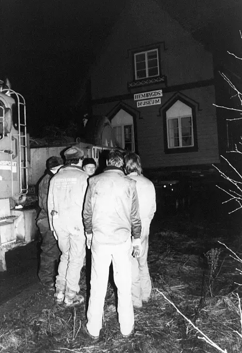 Hembygdsgårdar. Flyttning av Ingarö hembygdsmuseum vintern 1988.